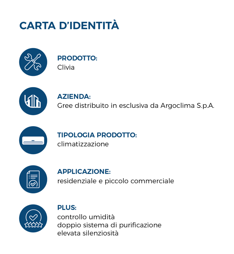 Il nostro nuovissimo climatizzatore CLIVIA infatti, aiuta l’utente ad avere un’esperienza di utilizzo superiore ed un comfort abitativo senza paragoni. Questa macchina lavora principalmente tenendo monitorate le abitudini di utilizzo, per garantire il massimo comfort e un vantaggioso contenimento dei consumi.  Clivia è dotato di sistema G-AI, cioè di intelligenza artificiale, che grazie ad un algoritmo intelligente impara a conoscere tutte le abitudini di utilizzo, al fine di ottimizzare il risparmio energetico e garantire il comfort desiderato in ogni angolo della casa o dell’ufficio.Clivia può risparmiare fino al 15% dei consumi di energia all’anno, ovvero 176 kWh di elettricità e ridurre le emissioni di CO2 di 48 kg, che equivale all’anidride carbonica assorbita da un albero in un anno. Il design minimale e lo stile contemporaneo, permettono la sua installa-zione in tutti i tipi di ambiente. La scocca si caratterizza per la particolare lavorazione longitudinale fatta di piccole righe che creano un effetto Matt.