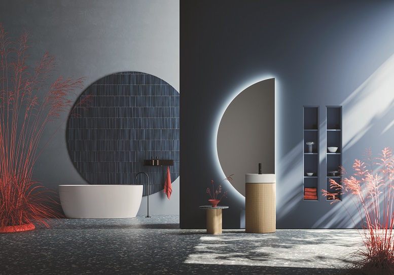 Nella foto, composizione Master #03 di Arbi Arredobagno: base portalavabo in Rovere Bricks Essenza Con lavabo Ercole in Ocritech; specchiara Demilune con luce led perimetrale e elementi Regolo in laccato Blu Lapponia opaco. A sinistra, vasca freestanding Clio in Mineral Composite opaco.
