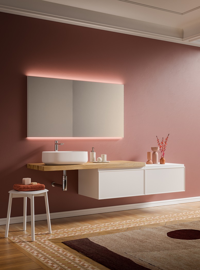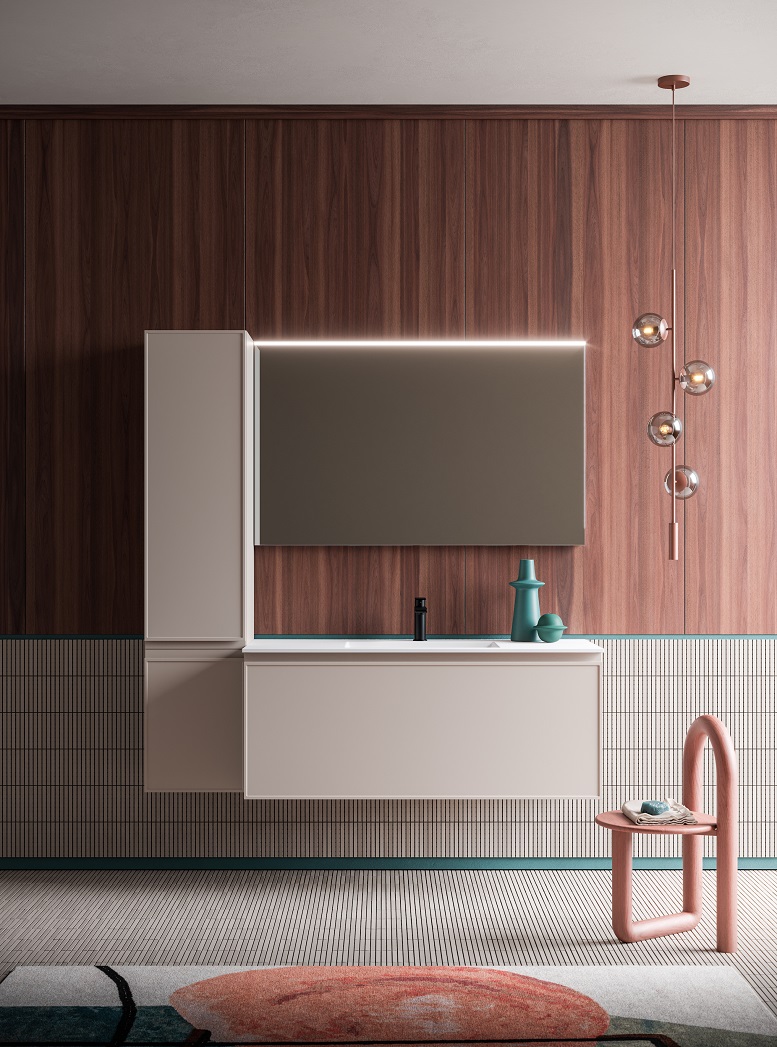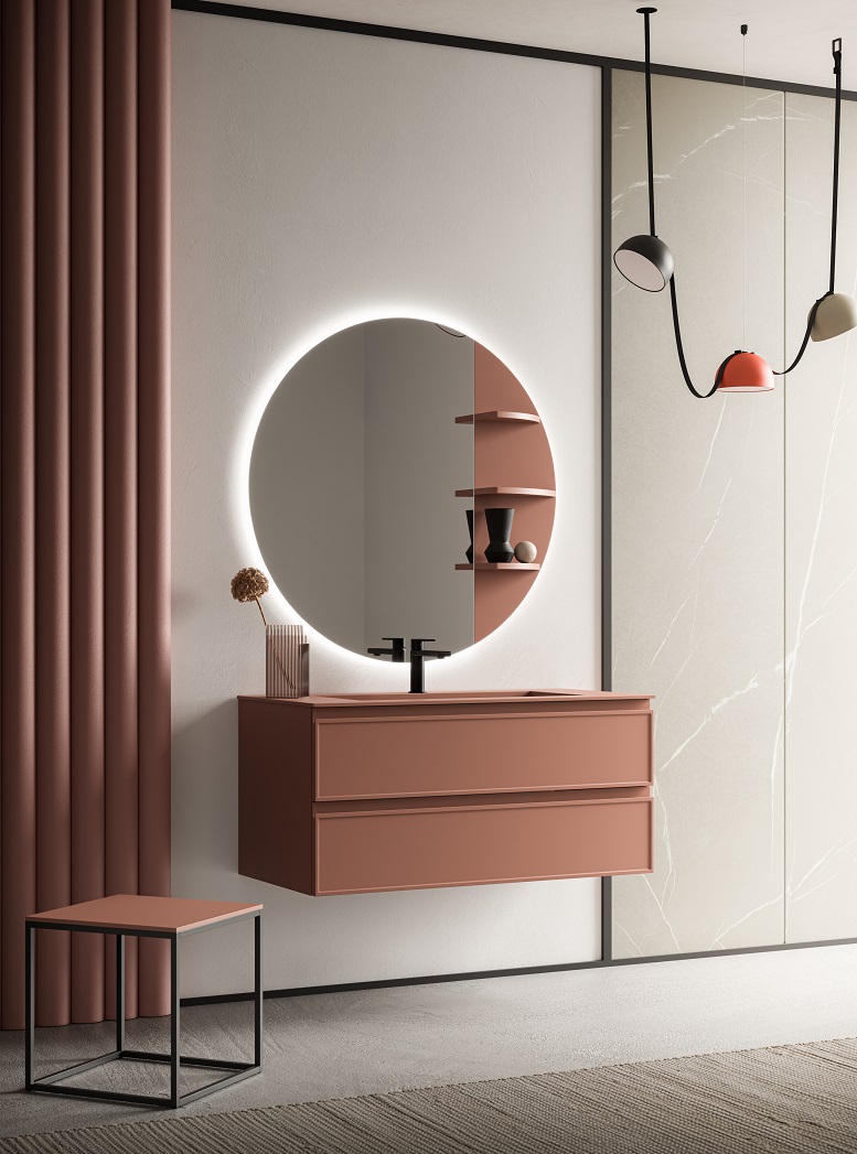 Nella foto, composizione Decor di Arbi Arredobagno: base sospesa in laccato Tan Pink opaco abbinato al piano top con lavabo Plaza integrato in Tekno Colore; specchiera Giotto ø 100 cm con luce led perimetrale.