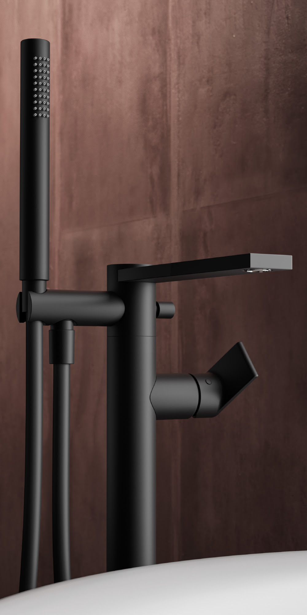 La soluzione per la vasca a pavimento consiste in un corpo cilindrico di mm 875 di altezza, dotato di una bocca slanciata di mm 197, doccetta a mano dalla linea minimale e munito di comodo flessibile antitorsione. È la soluzione ideale a vista da abbinare ad una vasca freestanding, grazie al suo design elegante.