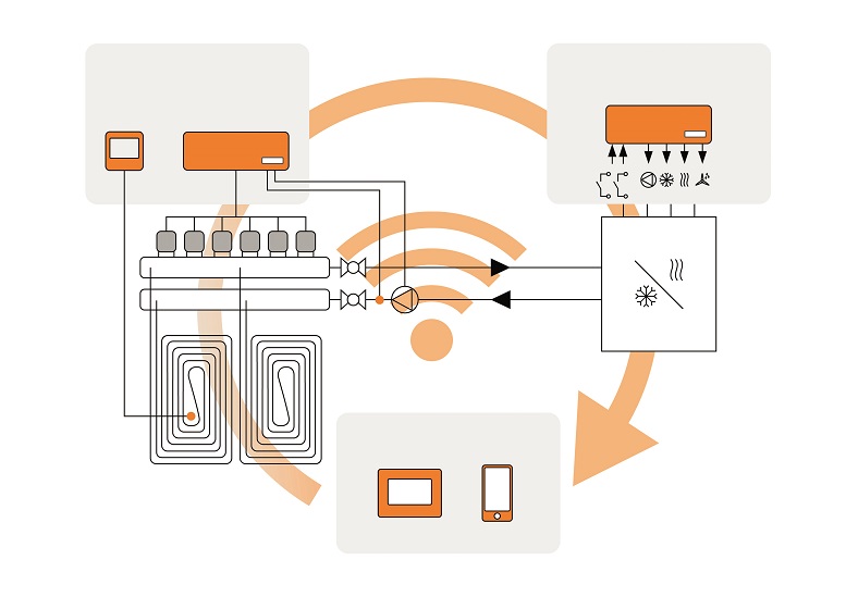 Nell’impostazione di base, le room unit, il modulo distributore e il modulo di gestione del raffrescamento e dell’umidità, comunicano via radio in modo bidirezionale. Ogni stanza può essere monitorata e controllata dalla propria room unit. In modalità smart home, i regolatori di temperatura ambiente e il modulo di riscaldamento/raffrescamento/umidità possono essere controllati anche l’unità centrale opzionale o tramite app.