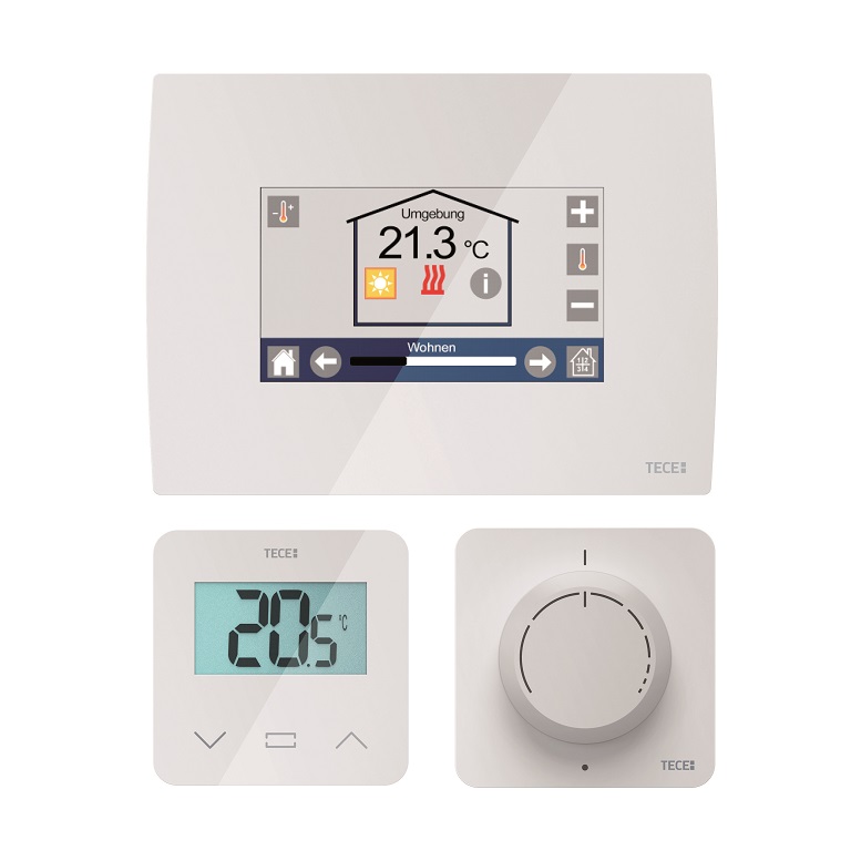 TECEfloor I termostati ambiente Tece con sensori di temperatura e umidità integrati controllano in modo affidabile il clima della stanza e comunicano via radio bidirezionalmente con la centralina di distribuzione TECEfloor, che controlla l’alimentazione delle varie zone. È possibile, inoltre, abbinare i sensori a pavimento alle room unit di ogni ambiente, assicurando una temperatura sempre gradevole e calcolando al meglio il punto di rugiada con i sensori di temperatura e umidità ambientali.
