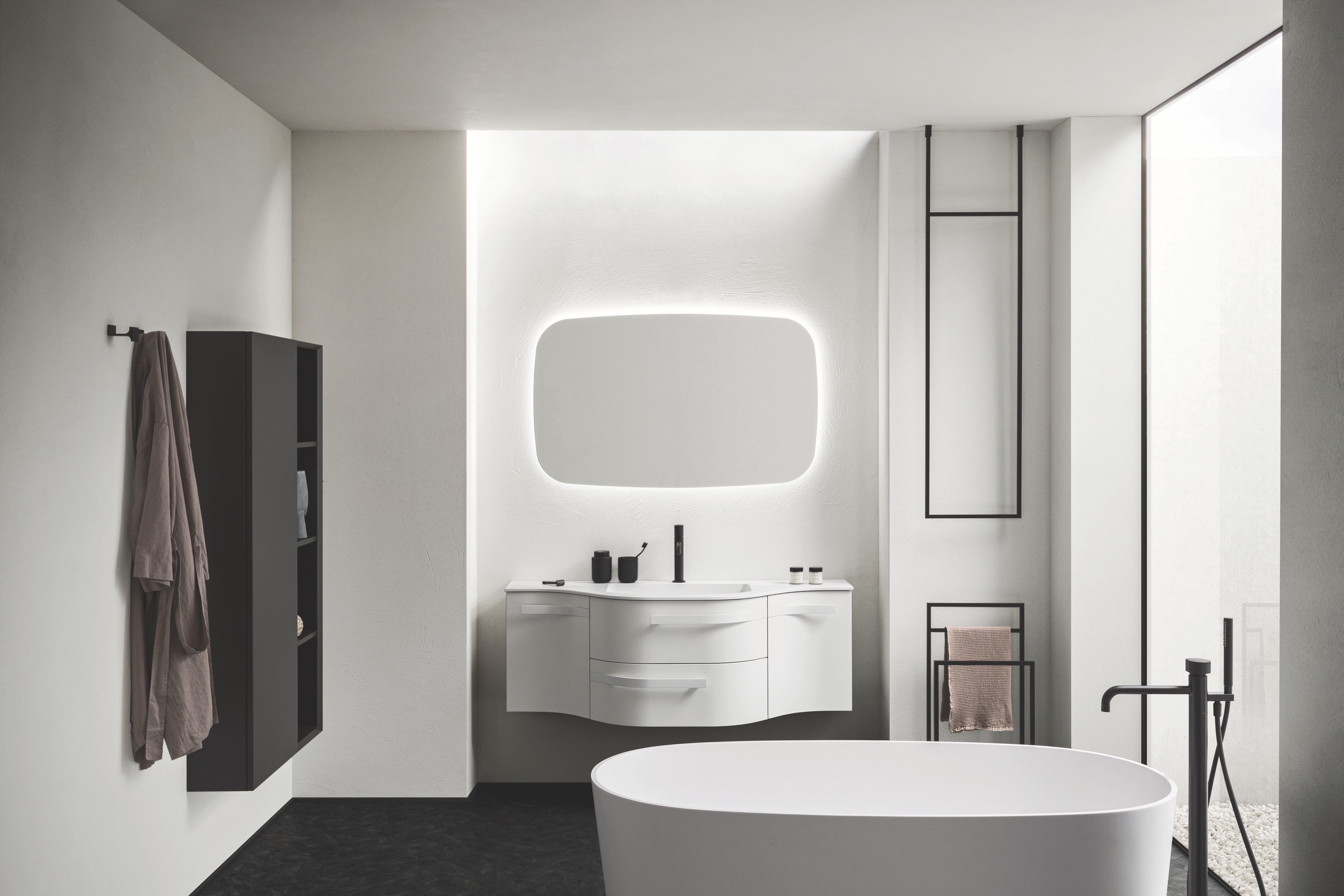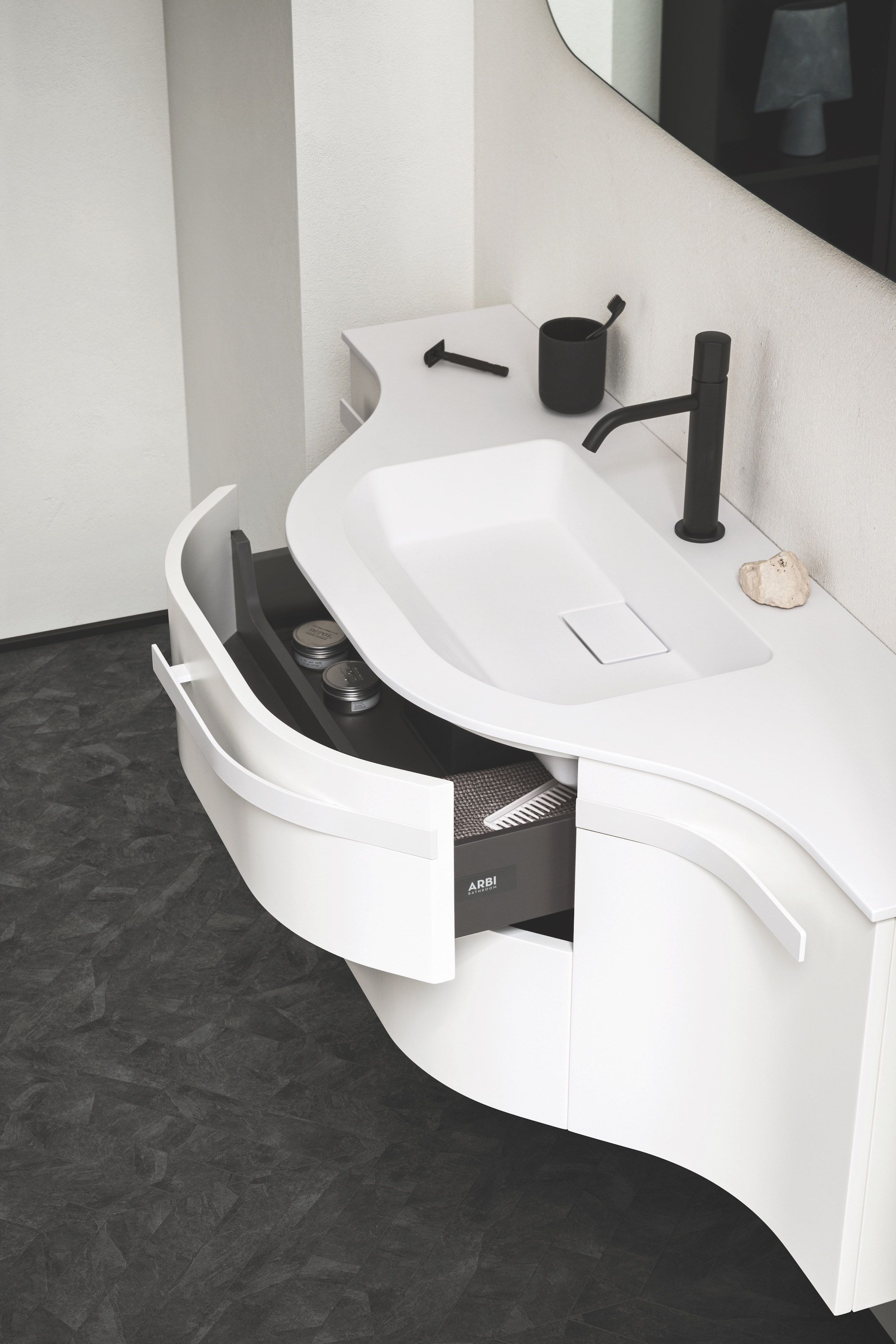 La maniglia e le linee curve del mobile e del piano sono state disegnate per Arbi da Meneghello Paolelli Associati.