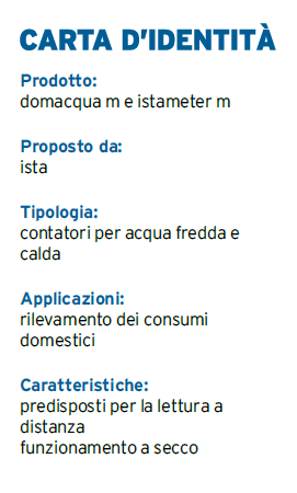 domacqua m di ista è un contatore sopra intonaco del tipo a elica mono getto, con innesto magnetico e unità di calcolo a rulli, adatto anche al rilevamento di piccoli consumi di acqua fredda e calda, mentre istameter m è un contatore con misurazione volumetrica multi-getto, con innesto magnetico e unità di calcolo a rulli, per l’installazione sopra e sotto intonaco.