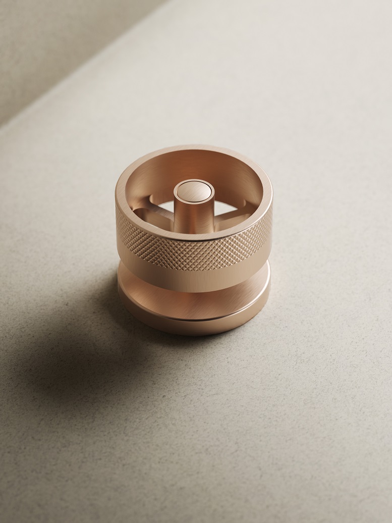 Altrettanto interessante è il motivo della godronatura – “L’ispirazione è nata dall’accendino Dupont” – lavorata per ottenere una texture sottile, leggera, tattile in un giusto gradiente decorativo e al contempo funzionale, in quanto questa zigrinatura facilita la presa, soprattutto con le mani bagnate. In un necessario e proficuo confronto con l’azienda i designer hanno valutato tutti i dettagli tecnici, bilanciando il rapporto tra le parti decorate e quelle lisce, la proporzione tra la sospensione e l’altezza del cilindro, valutando il peso della maniglia.