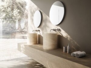 Una “magia” realizzata con l’indispensabile ingegnerizzazione compiuta dall’ufficio tecnico dell’azienda – CRISTINA Design Lab – alla continua ricerca del delicato equilibrio tra forma e funzione. La manopola risulta infatti sospesa grazie all’espediente del fissaggio mascherato posto alla base, mentre le due cartucce ceramiche sono mimetizzate all’interno del piano del lavabo.