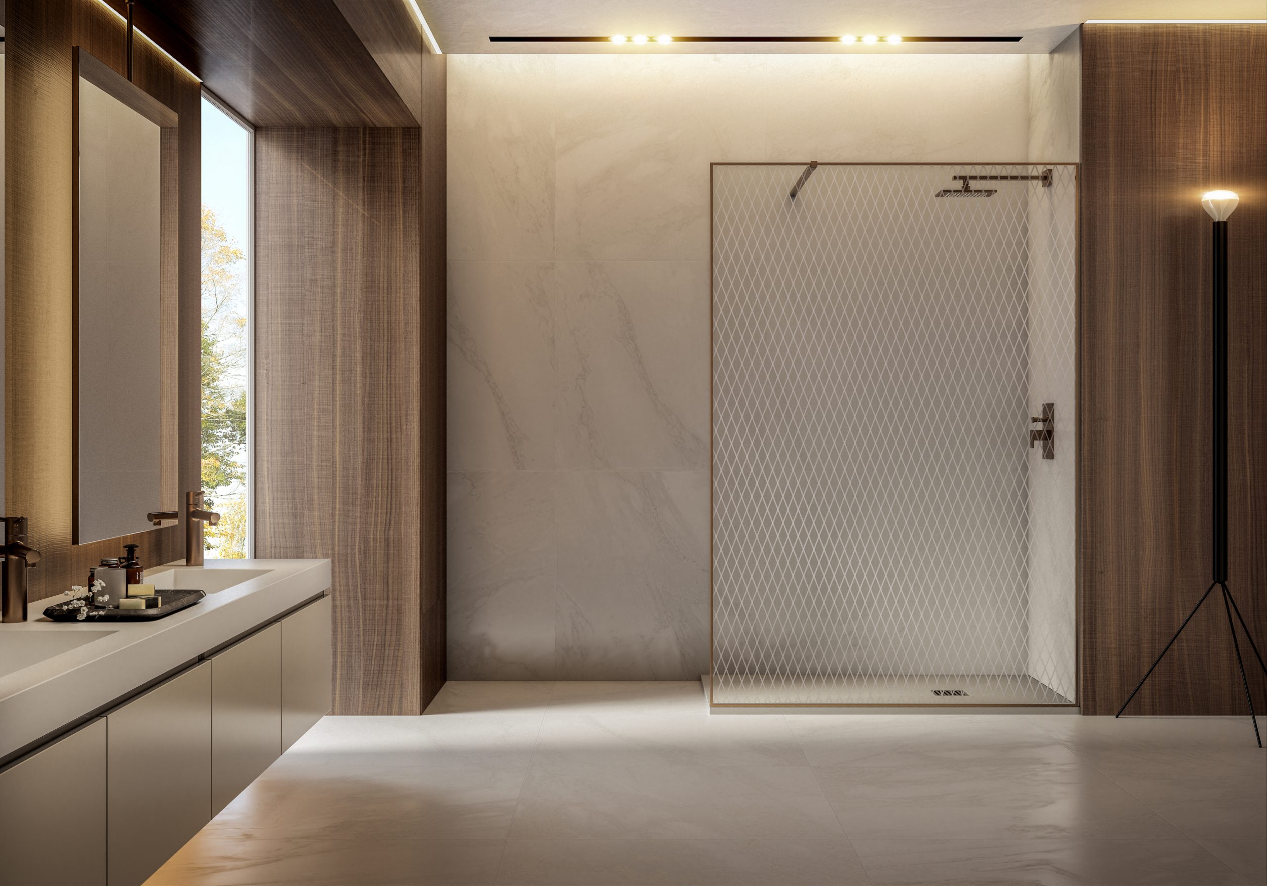La collezione Wall nella finitura Decoro Rombi è la soluzione perfetta per chi desidera un’estetica pulita e minimalista. Pannelli di vetro aperti si stagliano a protezione dell’area doccia, senza chiudere o limitare la stessa, integrandosi perfettamente con l’ambiente, per una soluzione poco invasiva che consente infinite possibilità di personalizzazione. Non occorre fare altro che scegliere il telaio in alluminio e il tipo di vetro temperato, da abbinare a seconda dei gusti e delle necessità.