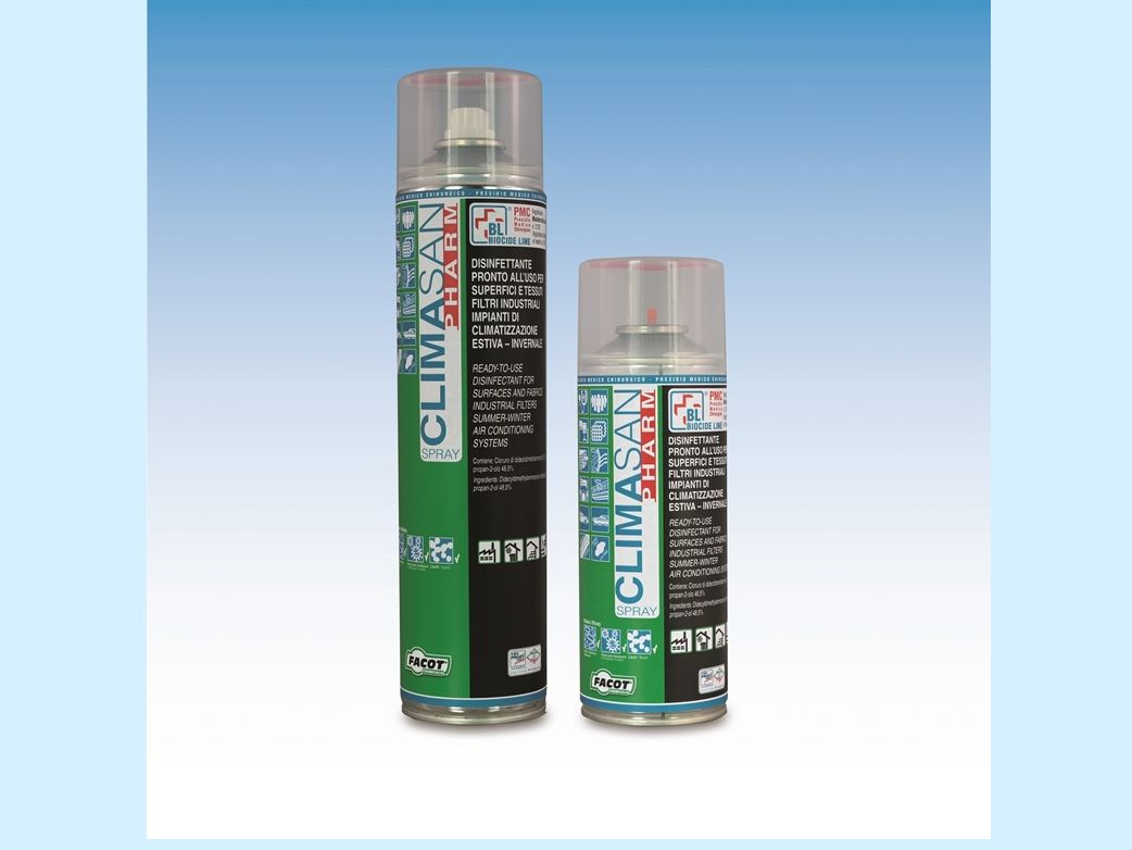 disinfettanteClimasan Pharm Spray di Facot Chemicals (Capralba, CR) è un disinfettante aerosol pronto all’uso per superfici e tessuti, filtri industriali impianti di climatizzazione estiva-invernale.