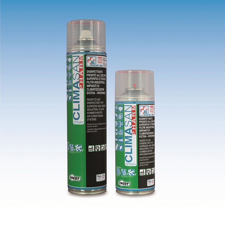 disinfettanteClimasan Pharm Spray di Facot Chemicals (Capralba, CR) è un disinfettante aerosol pronto all’uso per superfici e tessuti, filtri industriali impianti di climatizzazione estiva-invernale.