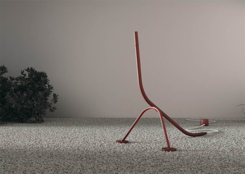 Il corpo principale della nuova proposta è formato infatti da un tubo metallico che si stacca da terra – fungendo anche da custodia del doccino estraibile – e appoggia la parte anteriore su due gambe sottili che evocano le sembianze di un esile animaletto dalle forme allungate ed eleganti, proprio come l’insetto Stecco a cui deve il suo nome.