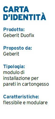 Geberit Duofix è la gam­ma completa di modu­li d’installazione pronti all’uso, universali e autoportan­ti, che si montano in modo facile e veloce, essendo dotati di tutti i collegamenti idraulici. In parti­colare, Duofix è la soluzione ide­ale per le applicazioni idrosani­tarie all’interno di una struttu­ra in cartongesso. L’assortimen­to comprende moduli per WC sia da 8 cm che da 12 cm, oltre che per lavabi, bidet e orinatoi, per la realizzazione di un bagno completo sia nel pubblico che nel privato.