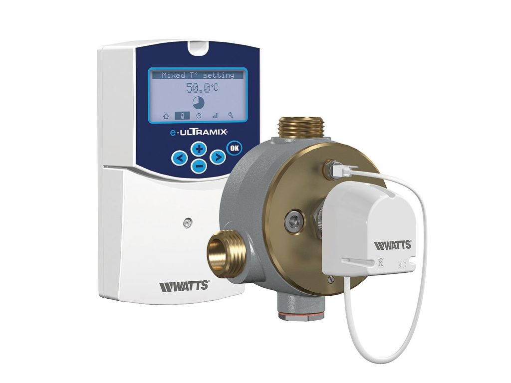 e-ULTRAMIX è un sistema di nuova generazione progettato da WATTS per regolare elettronicamente la temperatura dell’acqua miscelata in installazioni pubbliche. Questo sistema elettronico è dotato di un’unità di controllo intelligente (lo smart controller) che programma automaticamente i cicli di disinfezione termica prevenendo con sicurezza i rischi legati alla legionella nel sistema ACS. Agendo come un “giornale di bordo elettronico”, l’unità registra e archivia i parametri relativi al processo di disinfezione, le varie notifiche e gli allarmi garantendo un efficace monitoraggio sanitario dell’installazione. I dati possono essere recuperati utilizzando una micro SD card su cui sono stati salvati oppure tramite connessione in remoto a un sistema di Building Management System (protocollo MODBUS).