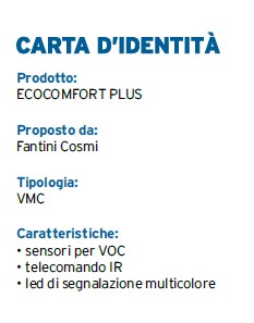 Fantini Cosmi continua a migliorare le funzionalità dei suoi prodotti per renderli semplici da installare e utilizzare. L’ultima novità riguarda l’offerta di ventilazione meccanica controllata (VMC) puntuale, con il nuovo ECOCOMFORT PLUS, l’unità di ventilazione con recupero di calore che affianca i modelli della serie ECOCOMFORT e presenta sensori VOC, un nuovo motore, nuove funzionalità e un telecomando a raggi infrarossi, per un utilizzo del dispositivo ancora più semplice e intuitivo.
