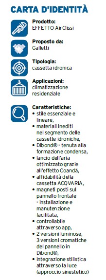 Proprio dall’esigenza di una maggiore necessità di integrazione tra il terminale idronico e l’ambiente da climatizzare, prende vita l’ultimo importante prodotto di Galletti: EFFETTO AirClissi la soluzione innovativa che integra all’interno del modulo di aspirazione aria ad effetto Coandă, un sottile layer di luce led, studiato appositamente per esaltare al massimo lo stile dell’ambiente in totale sinergia con i dispositivi di illuminazione principali.