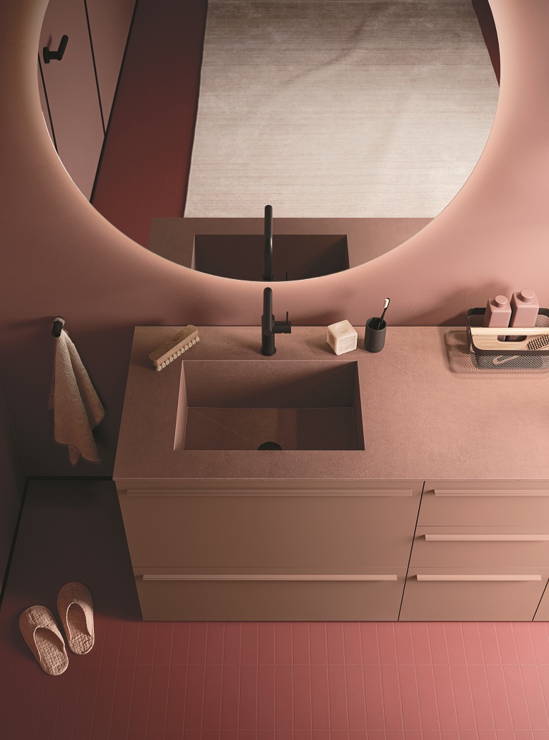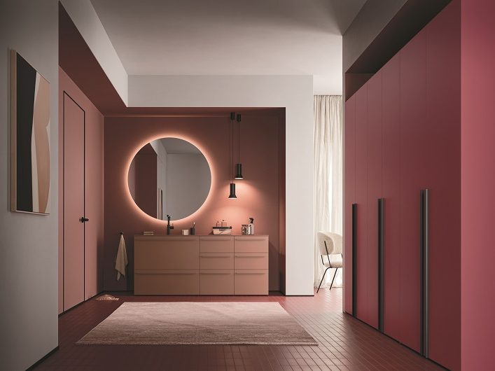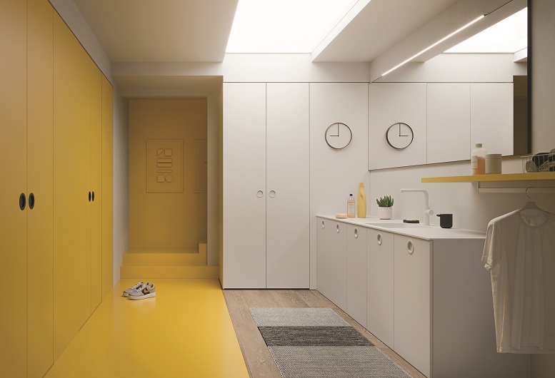 Diversi elementi contribuiscono a migliorare le caratteristiche di praticità del programma: l’asse da stiro ripiegabile e orientabile, sempre pronta all’uso; la barra LED sottopensile che illumina la zona di lavoro, rendendo ogni operazione più semplice e precisa; il lavabo Guru in Ocritech che, grazie alla tavoletta removibile e alla vasca profonda, può essere utilizzato sia come lavabo che come lavello, adattandosi alle necessità quotidiane. Le ceste portabiancheria integrate e i vari elementi modulari che non solo ottimizzano lo spazio, ma aiutano anche a nascondere vani tecnici e zone di disordine, mantenendo l’ambiente sempre ordinato.