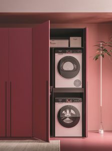 Tra gli elementi distintivi della collezione spiccano le colonne H 240, declinate in molteplici configurazioni intelligenti: strutture a giorno per lavatrice e asciugatrice, appendiabiti, ripiani, posti per carrelli, scarpiere e soluzioni attrezzate per ripostigli ad angolo. Ogni particolare è curato con precisione per garantire la pulizia visiva, nascondere gli elettrodomestici e ottimizzare lo spazio. Le ante, disponibili in varie tipologie di apertura – a battente, rientranti o a pacchetto – offrono massima flessibilità e si integrano perfettamente nel contesto architettonico.