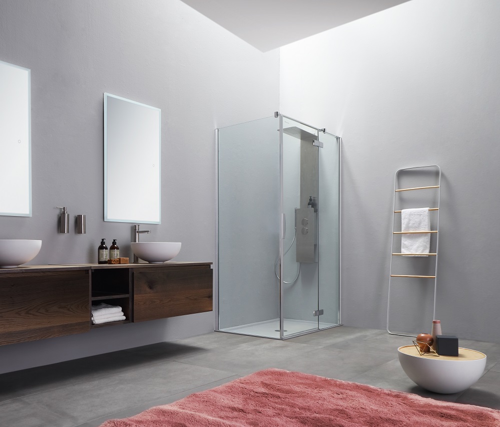 GL8 è disponibile esclusivamente con porta battente, per installazioni ad angolo e a nicchia.