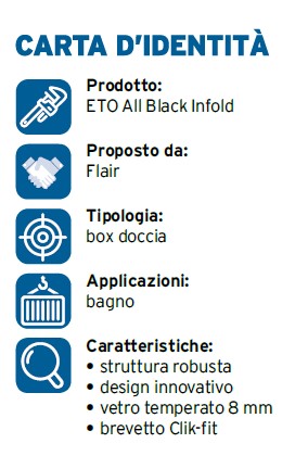 ETO All Black Infold (rototraslante) dispone anche di un brevetto Click-fit, esclusivo sistema di assemblaggio senza viti, e l’installazione è compatibile sia su piatto doccia che a filo pavimento.