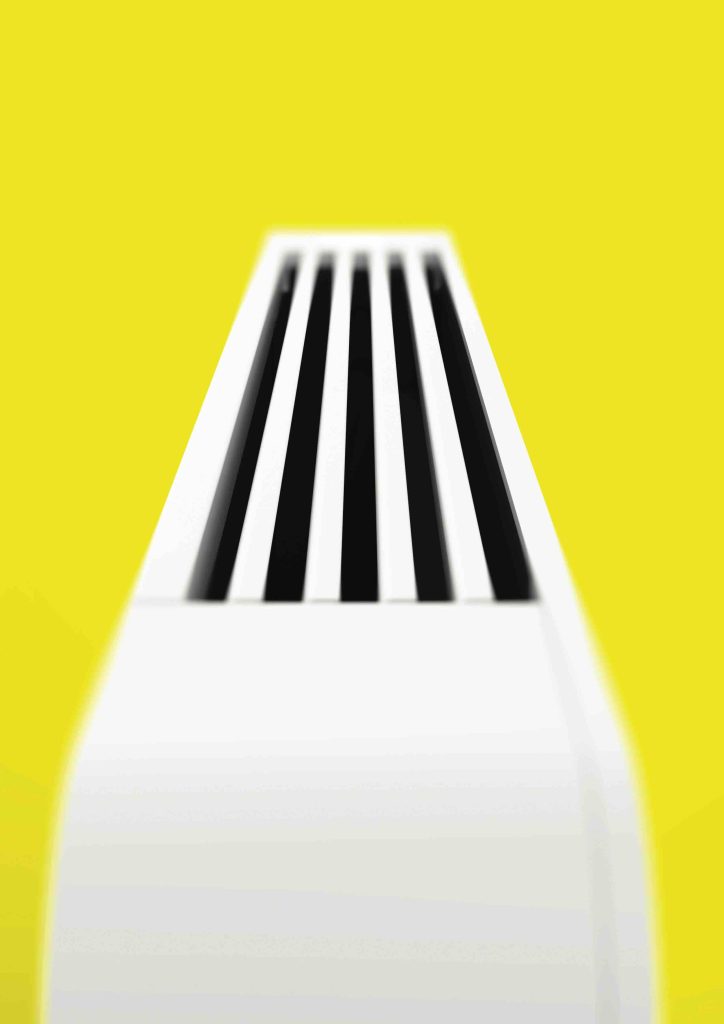 L’aspirazione avviene attraverso i micro-fori posti nella parte inferiore del pannello frontale e disposti secondo un pattern sfumato verso le estremità, mentre l’immissione dell’aria è invece affidata a profili lineari che orientano il flusso dell’aria verso l’alto ottimizzandone la miscelazione.