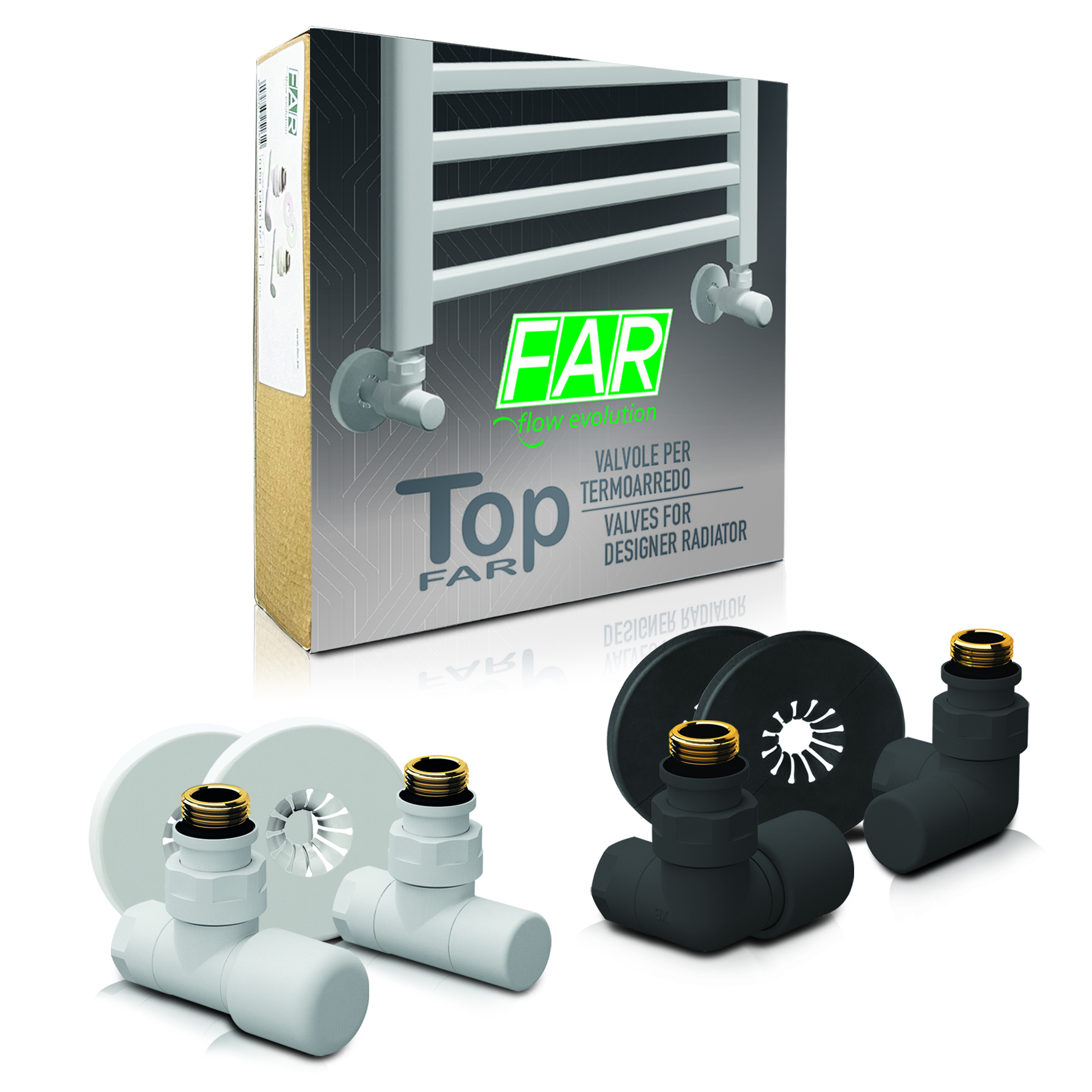 L’attenzione alle esigenze della propria clientela è un caposaldo della filosofia FAR. Con lo sviluppo di design innovativi per interni, nascono nuove necessità e nuovi modi di arredare la propria casa. Oggi si pone sempre più attenzione alle finiture, compresi gli accessori e la componentistica per i radiatori ed i termoarredi del proprio ambiente domestico. Per questo motivo, FAR propone diverse combinazioni della linea TOP FAR nelle finiture cromato, bianco cromo, bianco opaco e nero opaco. La confezione per ogni kit contiene: una valvola termostatica e un detentore nelle versioni a squadra o salvaspazio completi di calotta, n. 2 rosoni per tubazioni da Ø 10 a 20 mm, n. 2 adattatori per tubo rame Ø 10, 12 e 14 e n.2 adattatori per tubo multistrato Ø 16×2. I codici di riferimento dei kit sono: art.0156 per la versione salvaspazio con ingresso acqua a destra, art.0157 per la versione salvaspazio con ingresso acqua a sinistra e art.0158 per la versione a squadra. Valvola e detentore sono nella misura da 1/2″ con attacchi intercambiabili per tubo rame, plastica e multistrato e codolo preguarnito con guarnizione in EPDM.