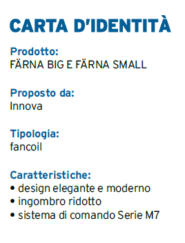 FÄRNA BIG e FÄRNA SMALL so­no la soluzione ideale per ga­rantire il massimo del comfort occupando il minimo dello spa­zio. La grande potenza con­centrata e le forme compatte ed eleganti risolvono ogni esi­genza funzionale ed estetica. FÄRNA BIG, infatti, offre a pari­tà di dimensione (larghezza 793 mm, altezza 540 mm) una po­tenza triplicata (2,80 kW in raf­freddamento e 3,06 kW in ri­scaldamento), mentre FÄRNA SMALL – che ha una larghezza di soli 550 mm per un’altezza di 440 mm (lo stesso ingombro di un trolley) – offre una poten­za di 1,50 kW in raffreddamento e 1,80 kW in riscaldamento pa­ragonabile a quella dei fancoil standard (comparazione effet­tuata sui modelli Airleaf di IN­NOVA).