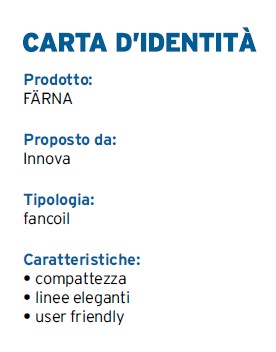 Elegante, compatto e potente, il fancoil FÄRNA di Innova è un elemento ad alto contenuto tecnologico ed estetico che offre una risposta alla domanda di miniaturizzazione dei terminali impiantistici per riscaldamento e raffrescamento. Disegnato da Luca Papini, FÄRNA è stato concepito come un vero e proprio elemento d’arredo contemporaneo e può essere installato sia negli edifici di nuova costruzione, come in quelli ristrutturati.