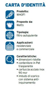 Watts è da sempre impegnata nello sviluppo di tecnologie contro lo spreco e il miglioramento della qualità dell’acqua nelle abitazioni, negli edifici pubblici e commerciali come hotel, ristoranti e club sportivi. Tra le soluzioni proposte, per una migliore qualità dell’acqua, Watts presenta il nuovo filtro per acqua autopulente (WHOF1) con sistema di lavaggio in controcorrente per l’efficace rimozione di sedimenti.