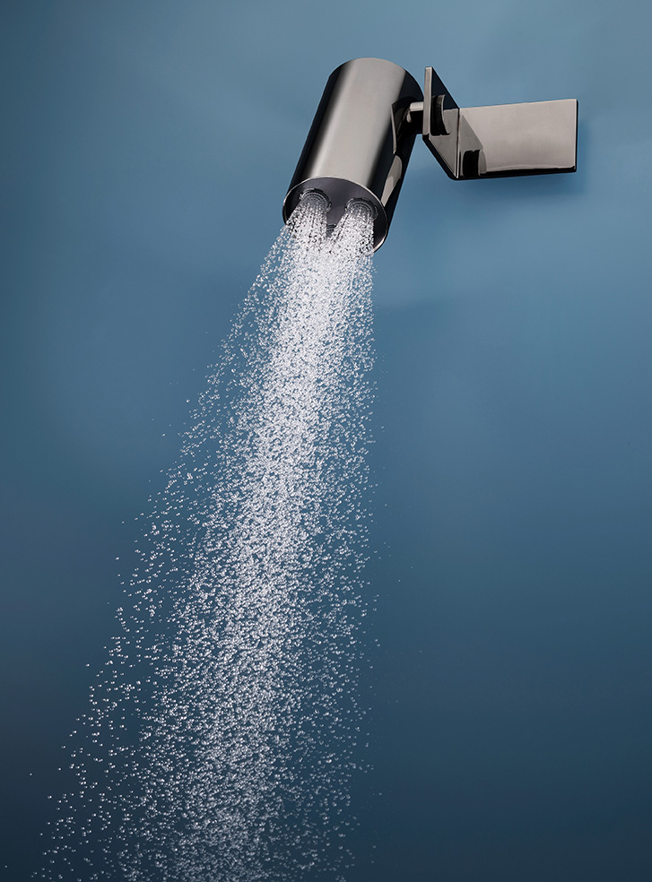 A livello formale le scelte progettuali, votate alla funzionalità e al design, vedono l’abbinamento dinamico di due elementi cardine del soffione: un corpo cilindrico che eroga l’acqua e un particolare elemento di supporto e distribuzione con forma a “L”. Questo elemento, a cui il corpo principale cilindrico del soffione è collegato a parete o a soffitto, ha la duplice funzione di portare l’acqua ai getti e di orientare il gruppo di erogazione, attraverso un innovativo sistema di snodo, in base alle esigenze del proprio rituale doccia. Segno peculiare è il suo sottile profilo, realizzato con tecnologie all’avanguardia, che con soli 6 mm di spessore rende l’erogazione dell’acqua quasi un gioco di magia.