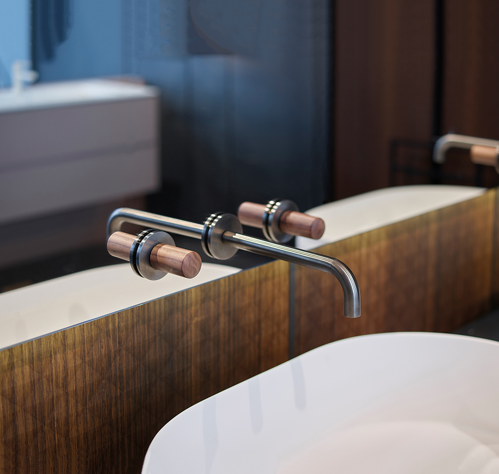 Fiore all’occhiello della serie è l’inedito miscelatore monoforo che presenta due comandi a rotazione, la cui funzione è ben identificata dalla dimensione e dalla posizione: a sinistra la manopola più piccola e alta, serve per regolare la temperatura e mantenerla preimpostata su quella desiderata; a destra, quella più grande e bassa per aprire e regolare il flusso.