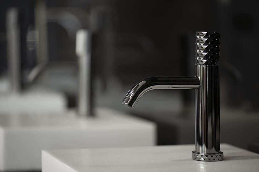 In Spillo Tech le forme minimaliste diventano iconiche grazie a tre preziosi decorativi, tre segni materici distinti che riproducono altrettante superfici tridimensionali con un gioco di rimandi dalla basetta alla leva, integrata armoniosamente nel corpo del miscelatore. Si tratta di: (X) Cross il cui naming svela un’elegante e lussuosa superficie finemente sfaccettata, ispirata al prezioso diamante intagliato, ideale per ambienti sofisticati; (V) Vertical, contraddistinta dal rigore geometrico di un poligono a 19 facce; (G) Godronata, che propone un effetto micro-diamantato dal mood fortemente industriale.