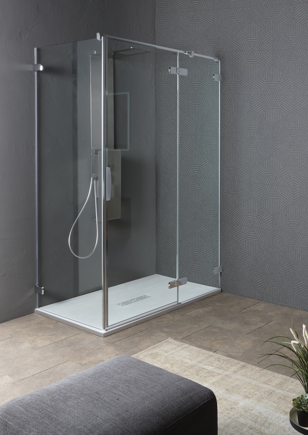 Il vetro a spessore 8 mm è dotato di pellicola di protezione Safety&Clean che, in caso di rottura del vetro temperato, trattiene tutti i frammenti evitando che questi si disperdano nell’ambiente circostante. GLX8 è disponibile, esclusivamente con porta battente, per installazioni ad angolo e a nicchia.