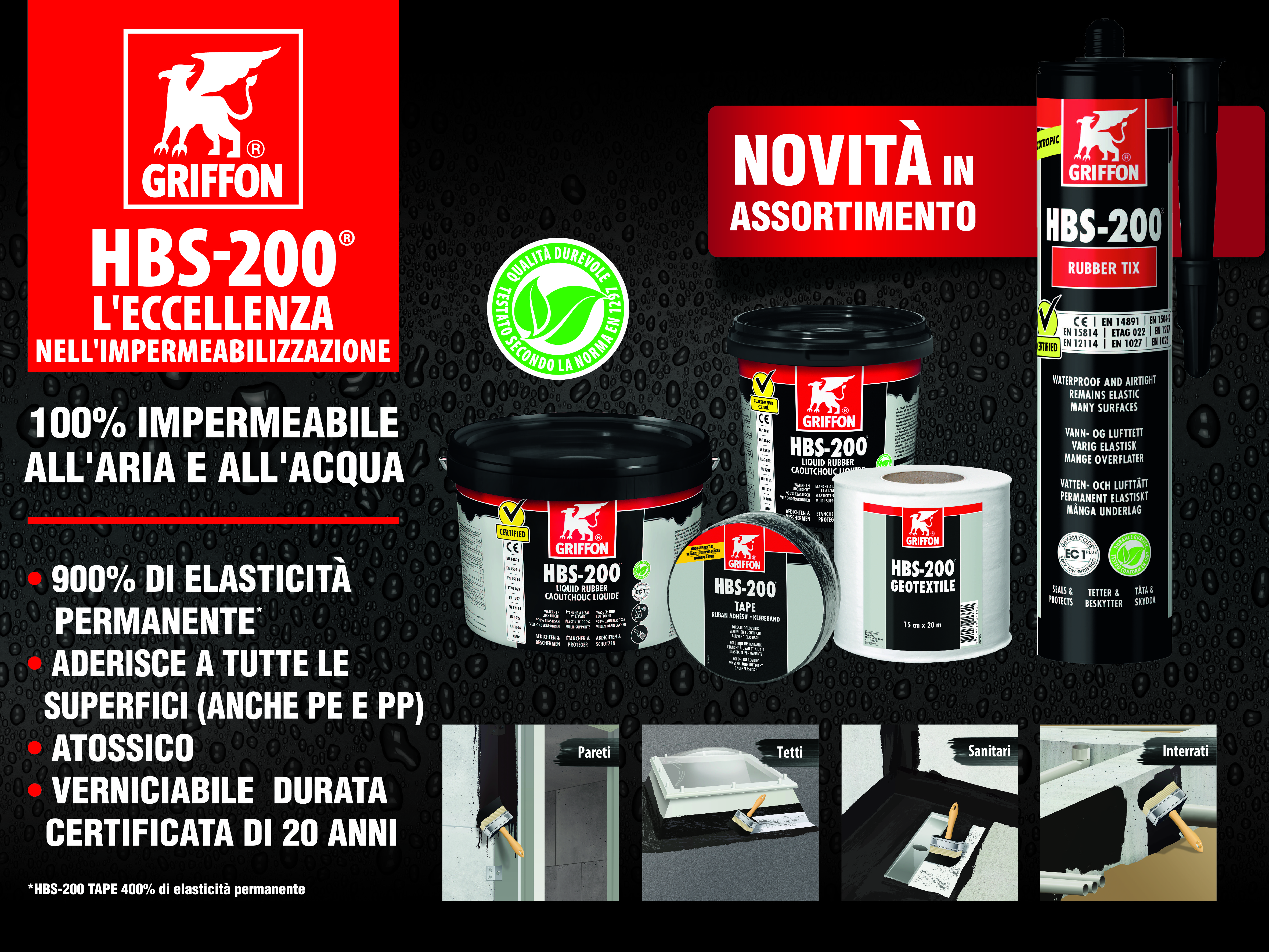GRIFFON® HBS-200 è un prodotto permanentemente elastico e facile da applicare. Sia in barattolo che in cartuccia, spalmare preferibilmente entro 10-15 minuti utilizzando una spatola, pennello o simili, resiste a temperature comprese tra -20 °C e +160 °C, ai raggi UV e agli agenti atmosferici.