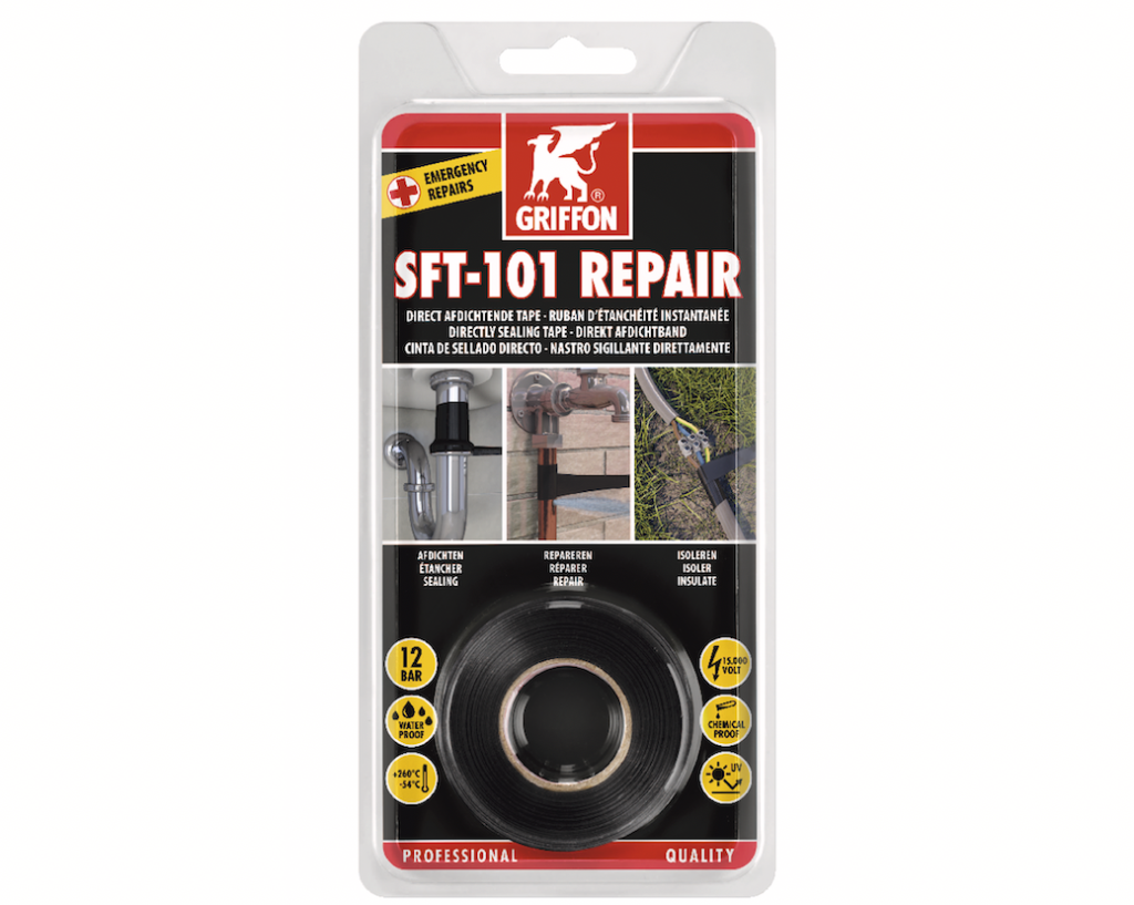 GRIFFON® SFT-101 è il nastro autoagglomerante ottimale per la sigillatura e riparazione rapida e semplice di perdite in condotte, tubi, raccordi, sifoni e manicotti. Utilizzabile anche per la sigillatura (impermeabile) di collegamenti elettrici e per l’isolamento e la protezione di spine e cavi elettrici. Adatto anche per unire oggetti uno con l’altro, raggruppare materiali, proteggere dalla ruggine e come antiscivolo per impugnature e utensili. Adatto per interni, esterni e sott’acqua.