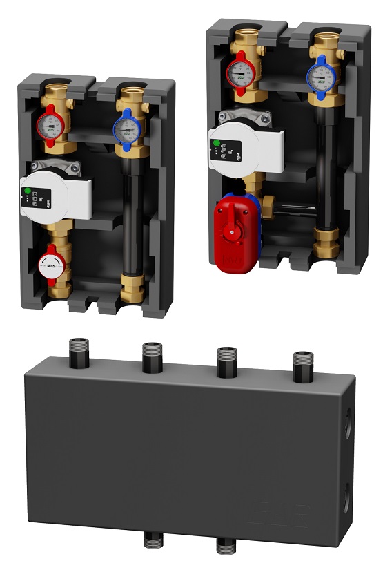 Per questi gruppi di rilancio, con attacchi femmina da 1”1/4, sono stati realizzati dei collettori di distribuzione per centrale termica disponibili con attacchi principali da 2” e derivazioni maschio da 1”1/4, che si aggiungono a quelli già disponibili da 1”1/4 con derivazione da 1”. Anche questo collettore viene fornito con guscio di coibentazione. Il collettore è venduto nelle versioni 2+1, 3+1 e 4+1.
