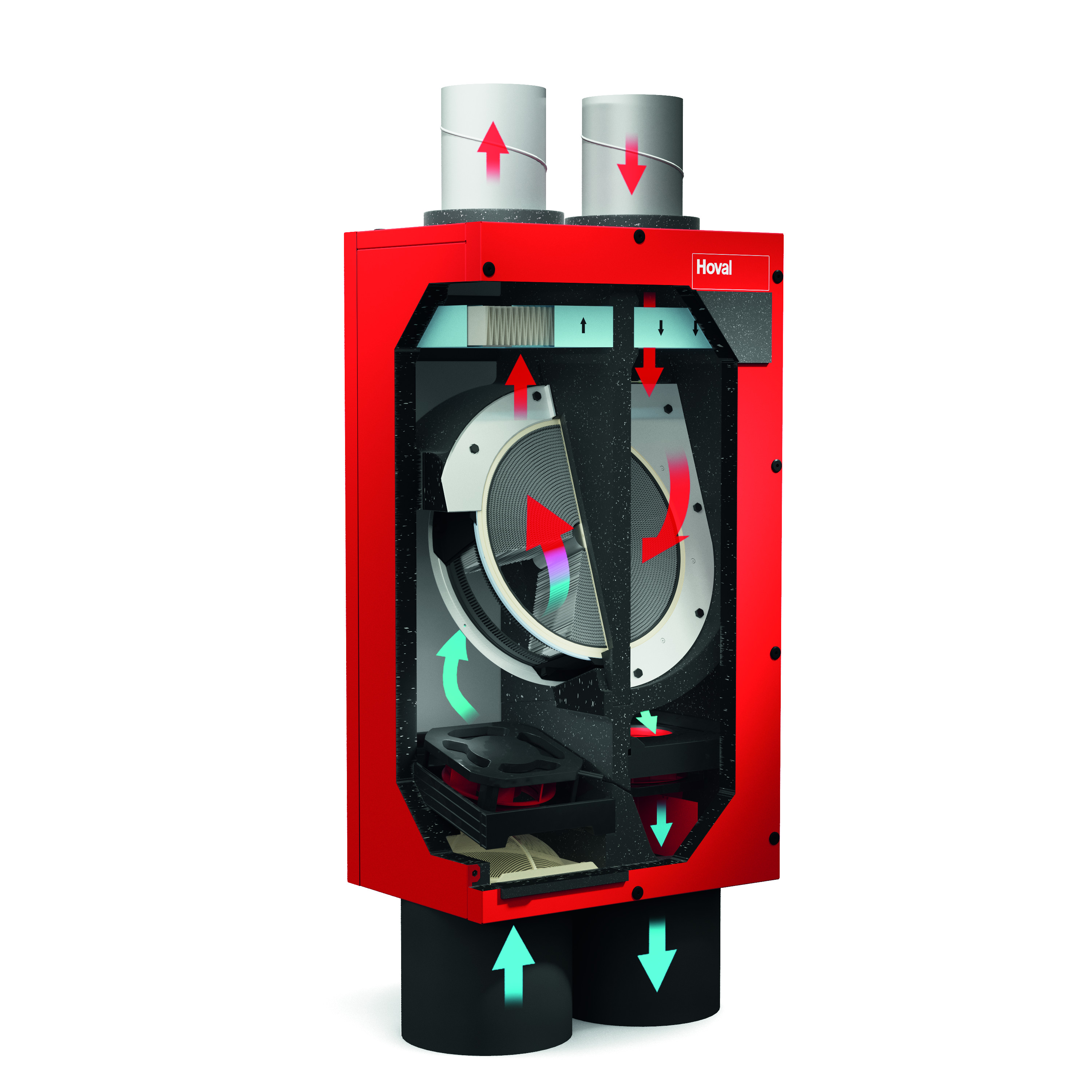 La ventilazione meccanica controllata HomeVent® di Hoval, silenziosa ed efficiente, sostituisce l’aria viziata con quella fresca, trasferendo a quest’ultima non solo il calore, ma anche l’umidità dell’aria ambiente. Il tutto tramite un’unica regolazione di sistema, Hoval Digital.