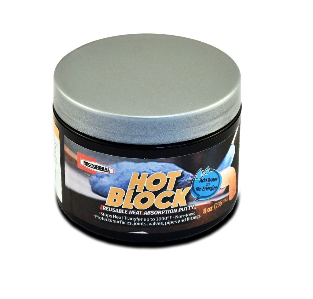 Rivolta a impiantisti, idraulici e frigoristi che saldano tubazioni in rame su impianti per gas metano o frigoriferi, Hot Block è la pasta assorbi/dissipa calore proposta da TDM. La sua funzione è dissipare il calore generato dal cannello con gas ossiacetilenico o propano, MIG, TIG e ad arco (fino a 1650°C) quando si deve effettuare un intervento su una linea dove, nelle vicinanze, ci sono componenti che potrebbero danneggiarsi a causa del calore diretto o conduttivo.