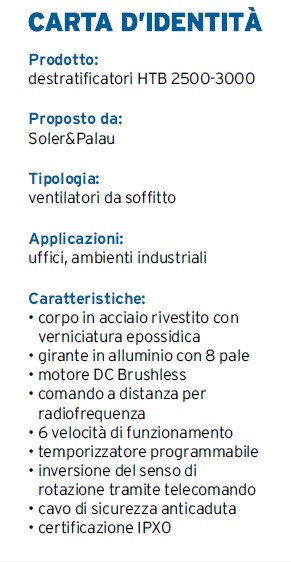 L’efficienza e il comfort sono fondamentali in ogni ambiente di lavoro e Soler&Palau ha la soluzione perfetta per questo tipo di esigenza: i destratificatori HTB 2500-3000. Questi ventilatori da soffitto di grande diametro (250 e 300 cm) sono progettati per soddisfare le esigenze di applicazioni commerciali e industriali e sono una soluzione affidabile per migliorare il comfort termico e l’efficienza energetica negli ambienti di lavoro.