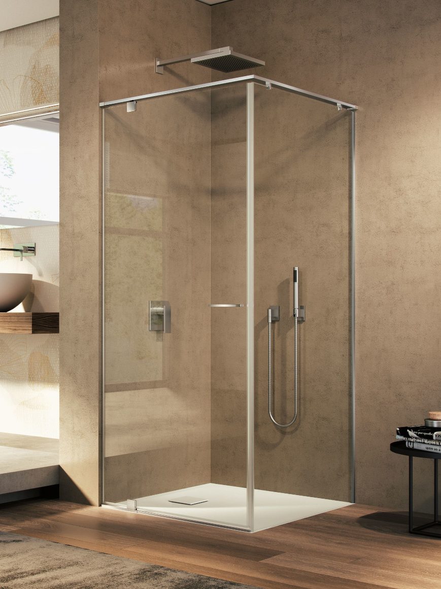 bagnoLa varietà di sistemi doccia di Provex consente a interior designer, architetti e utenti finali una progettazione versatile e personalizzata. Tra le numerose alternative, Iunix IUT-1 + IUW in vetro 8 mm – con porta basculante dotata di sistema a pendolo per apertura in/out fino a 360 gradi, affiancata al laterale – è la soluzione perfetta per una cabina doccia ad angolo. Profili, cerniere e maniglie sono disponibili in alluminio brillante lucido o nero matt e in acciaio AISI 316L.
