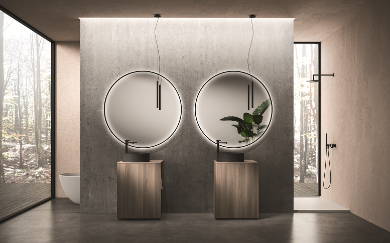 A completare la collezione, la stilosa serie di specchi da parete: disponibili in diverse tipologie di forme e dimensioni – dalle regolari a quelle più sinuose come il cerchio e la nuova mezzaluna – con optional di sbrinamento e retroilluminazione integrata.