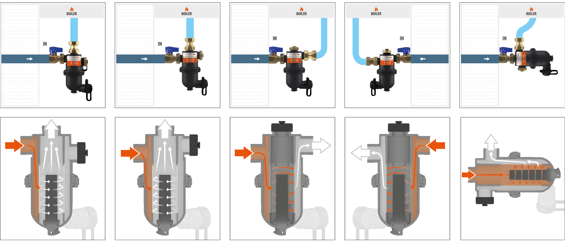 Costituito da un corpo in tecnopolimero che ne garantisce elevate prestazioni meccaniche e termiche, nonché la leggerezza e l’inattaccabilità dalle corrosioni, DIRTSTOP® EASY può essere facilmente pulito senza bisogno di svuotare l’impianto. Dirtstop® Easy può assumere fino a 5 configurazioni di installazione variando ingressi e uscite, che permettono in ogni caso la massima filtrazione e il perfetto funzionamento del dispositivo.