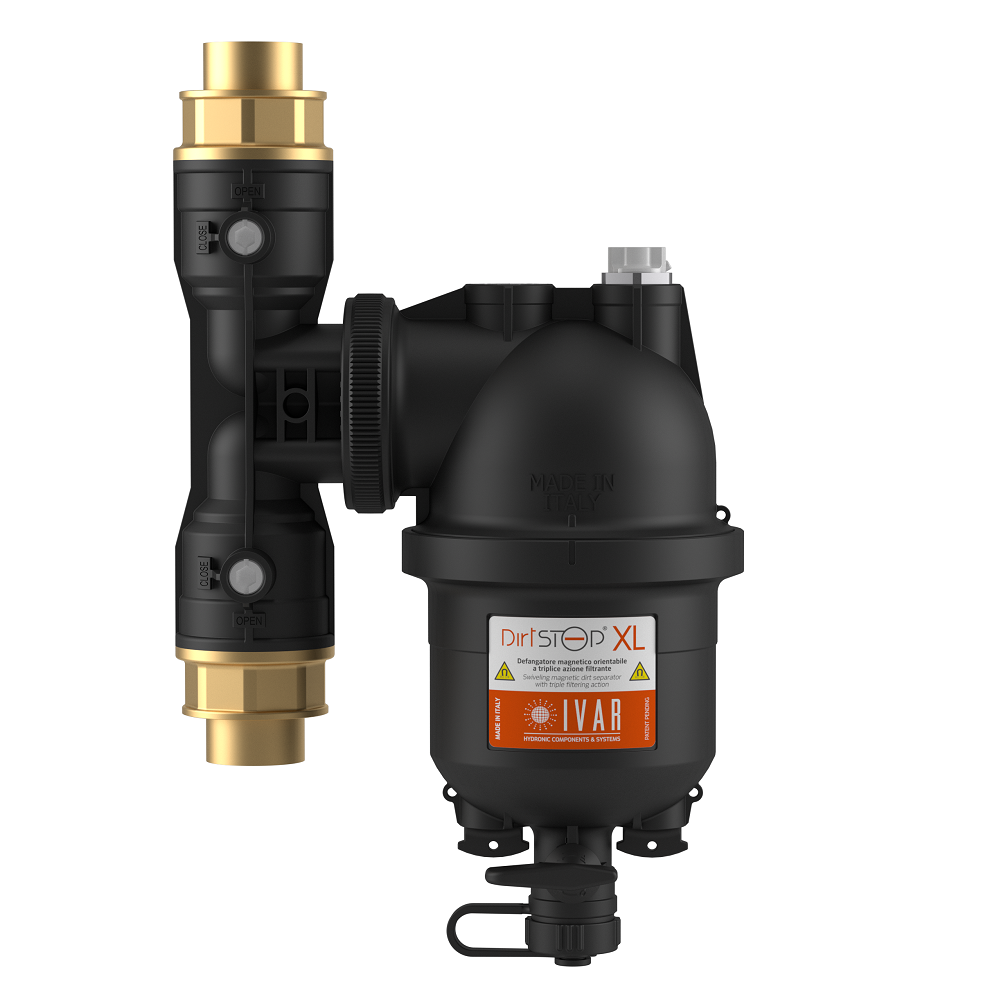 La gamma di prodotti IVAR per il trattamento acque contempla inoltre il defangatore magnetico orientabile a triplice azione filtrante DIRTSTOP® XL, la soluzione ideale in impianti con portate elevate.