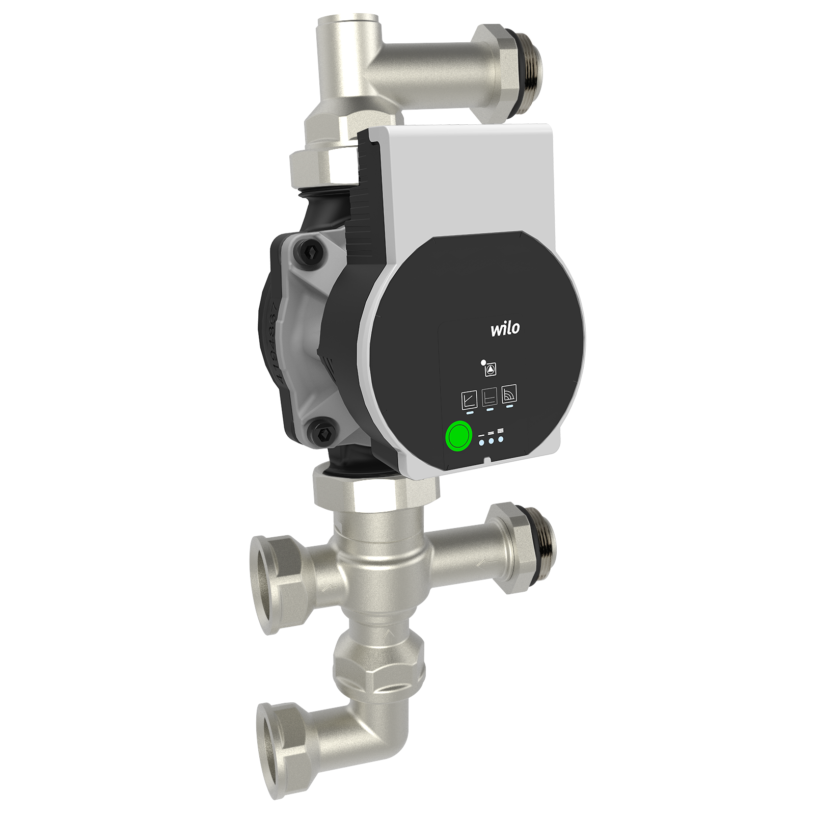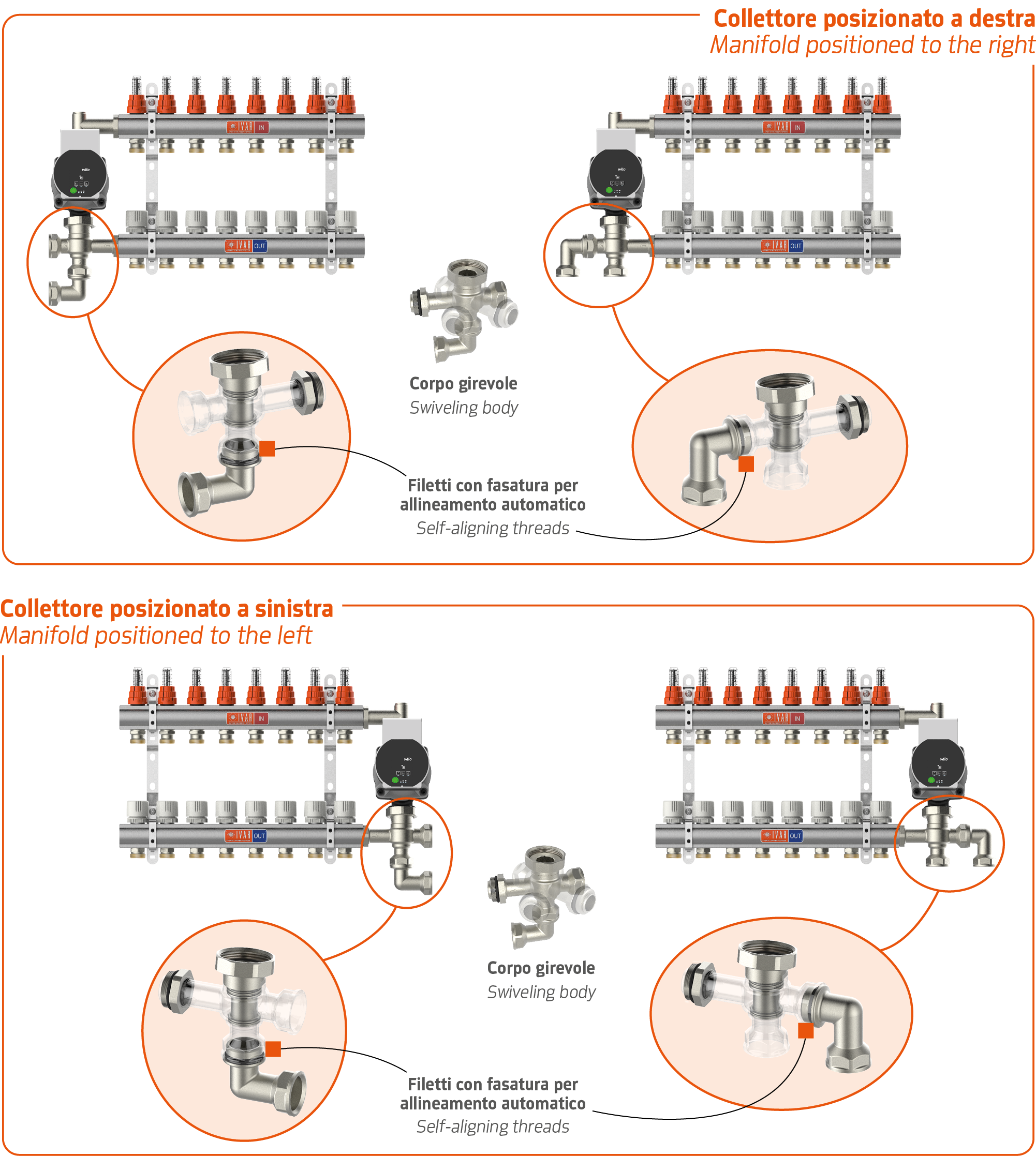 Il sistema presenta dei raccordi per la connessione del circolatore di rilancio e la temperatura di mandata alle utenze è gestita direttamente a monte, tipicamente dalla pompa di calore stessa. Heat Pump Kit si caratterizza per il raccordo di ingresso avente 4 connessioni di cui due presenti su un corpo girevole. Con questa caratteristica, il sistema si distingue per versatilità di installazione potendo il raccordo essere orientato in diverse modalità.