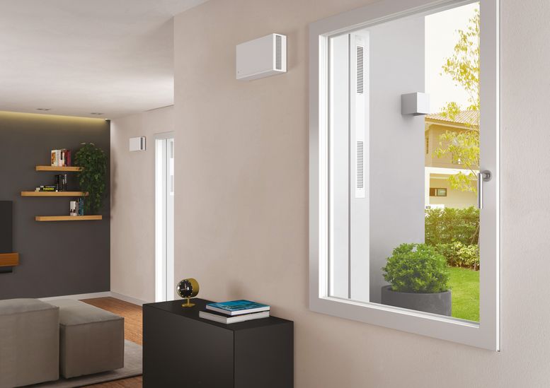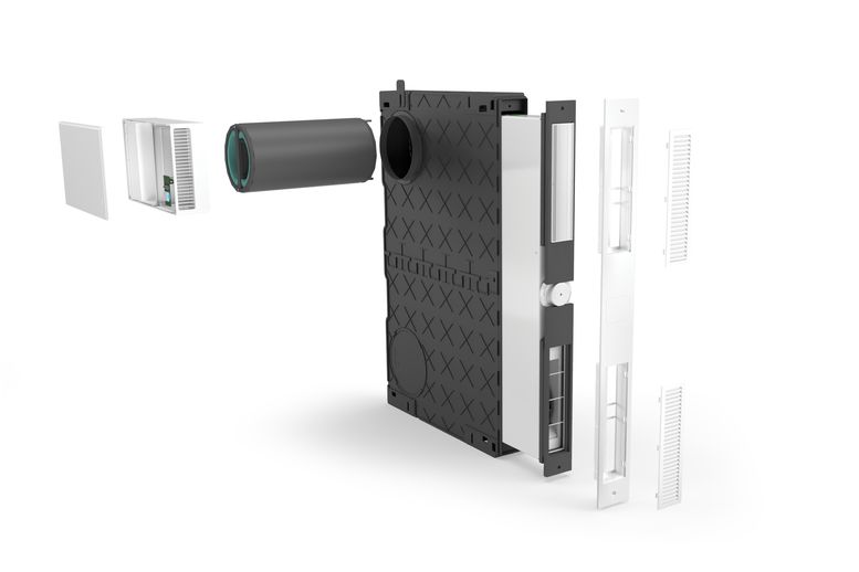 Dal punto di vista impiantistico, l’installazione, che avviene completamente dall’esterno durante la posa del cappotto, necessita solo di un singolo carotaggio da 160 mm, in cui passano i flussi d’aria in immissione ed estrazione separati da un apposito setto. La portata d’aria variabile fino a 70 m³/h assicura un ricambio continuo e controllato dell’aria anche in ambienti ad alta occupazione, mentre il filtro ePM2,5 65% (F7) di serie rimuove efficacemente particolato PM10 e PM2,5, nonché pollini, batteri e altre impurità. Lo scambiatore di calore entalpico a doppio flusso, infine, garantisce l’efficienza termica del sistema, permettendo di recuperare fino al 70% del calore dell’aria in uscita per preriscaldare quella in entrata.