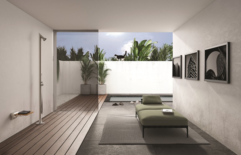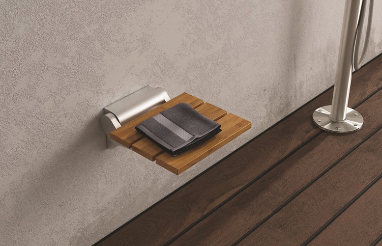 Nell’immagine si inserisce anche la seduta BAMBOO, parte del progetto di Damast “Design for All”. Si tratta di una seduta comfort pieghevole in bambù naturale (dimensioni mm 310×260), composta da tre doghe rettangolari con tipiche venature e da un robusto telaio in alluminio resistente all’acqua. Saldamente ancorata al muro con una placca di fissaggio a cinque tasselli, è in grado di sostenere un peso massimo di 130 kg. Determinante in questo caso la scelta del bambù come materiale naturale, resistente ed ecologico.