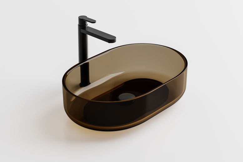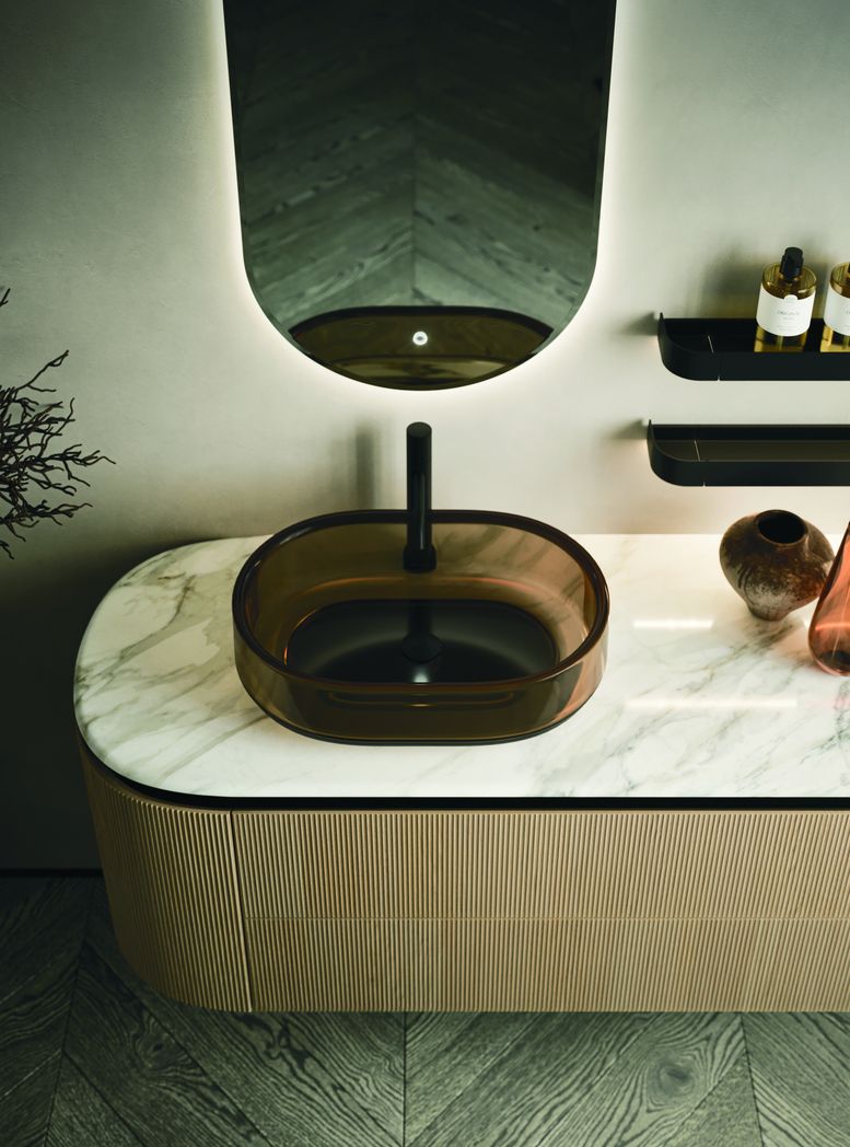 In primo piano, il lavabo Easy 55, realizzato in Acrilico Bronzo definisce un volume fluido e trasparente, conferendo leggerezza all’insieme.
