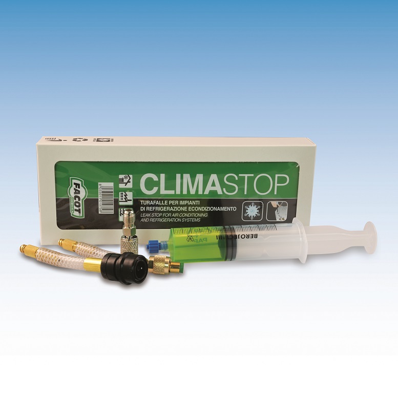 Il prodotto di Facot Chemicals (Capralba, CR) localizza la perdita di gas refrigerante e la sigilla in modo permanente, senza reagire con l’umidità e l’ossigeno presenti nell’impianto, ma semplicemente con l’aria esterna in corrispondenza della perdita. CLIMASTOP ripara perdite della dimensione massima di 0,5 mm. A tal proposito sarà necessario creare il vuoto nell’impianto e verificare che rimanga in tali condizioni per almeno cinque minuti, solo in questo caso la perdita sarà riparabile chimicamente con CLIMASTOP.