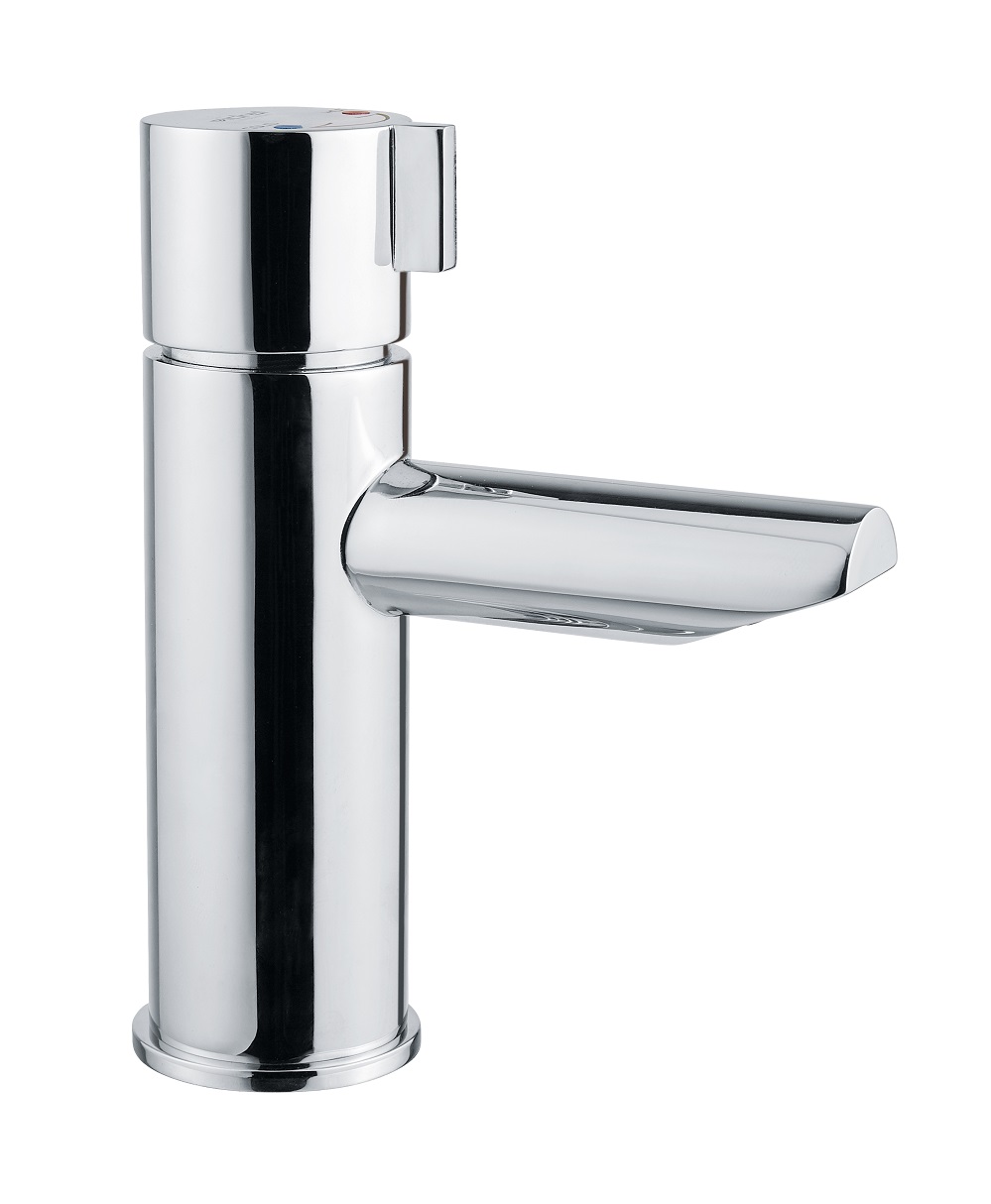 Comando a pulsante a scarico di pressione per apertura del rubinetto con una corsa ridotta (1mm) e riduzione della forza di pressione necessaria all’attivazione. Miscelazione comandata con un semplice movimento rotatorio della maniglia che permette, grazie anche alla sua temporizzazione, la gestione della regolazione utilizzando una sola mano.
