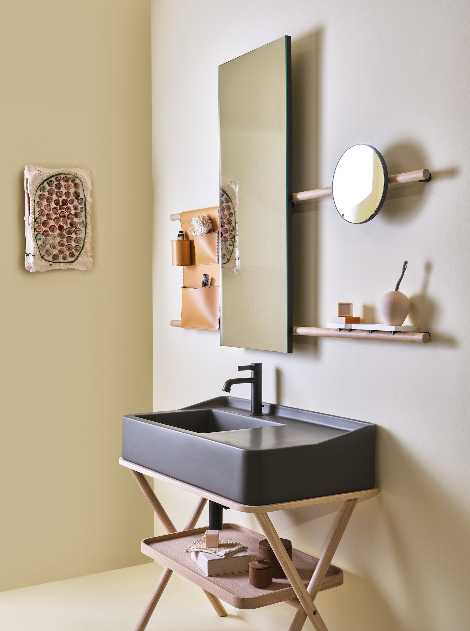 Integrato al lavabo in ceramica, rettangolare e profondo, declinabile nelle 16 nuance dell’esclusiva palette cromatica “Terre di Cielo”, è un ampio piano di appoggio che assicura la massima praticità. La struttura a ‘cavalletto’ che sorregge il lavabo è disponibile in 2 finiture in metallo – Nero Matt, Cemento – o in legno nelle pregiate essenze Rovere Naturale, Rovere Sbiancato, Rovere Grigio, Rovere Nero. A impreziosire e rendere ancora più funzionale la struttura sono il vassoio o il cassetto, entrambi disponibili in 8 delicate tonalità per il legno laccato e in 4 essenze in legno Rovere – Naturale, Sbiancato, Grigio e Nero.