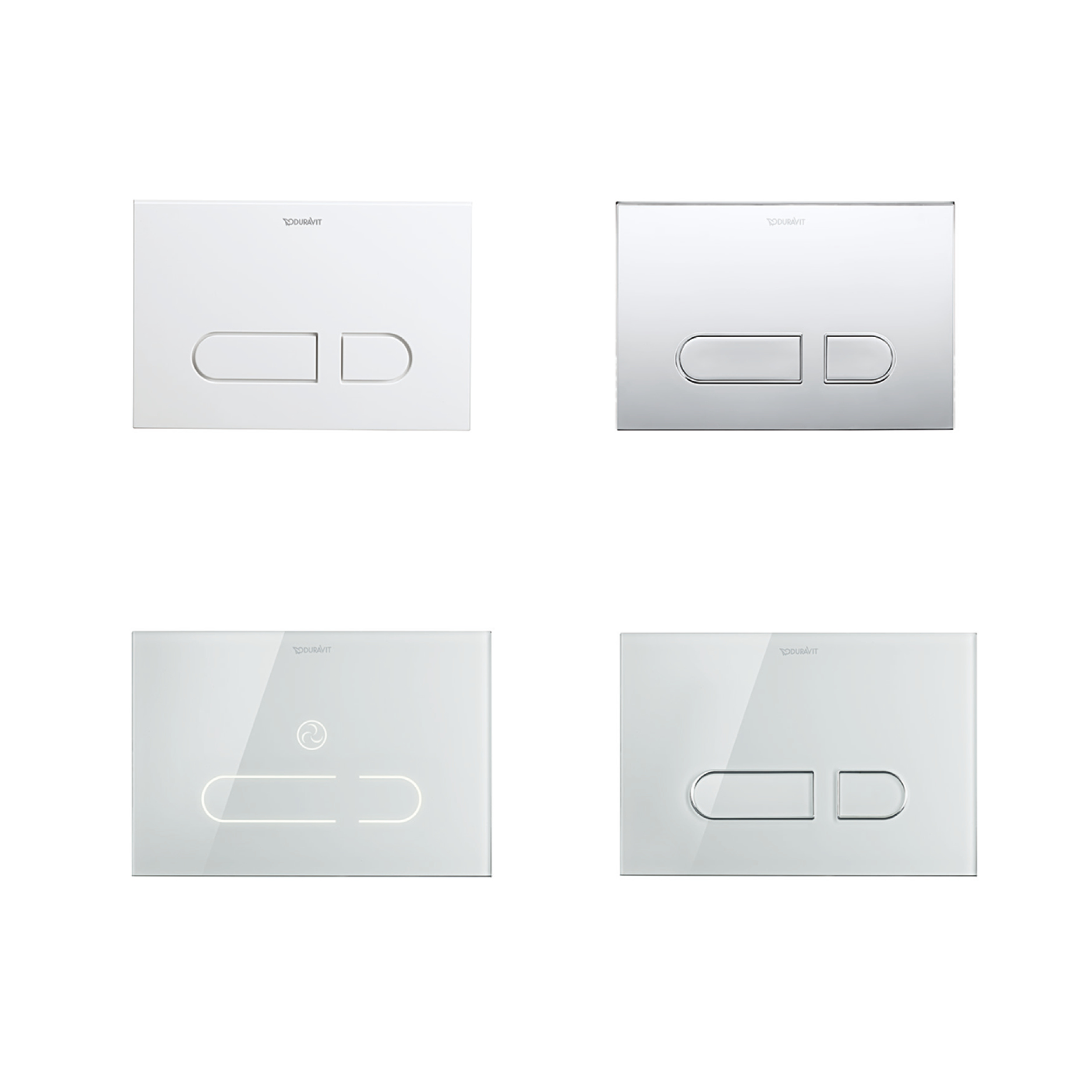 Le placche di comando sono disponibili nel tipico design Duravit nella variante ad azionamento meccanico “A1” in plastica bianca o cromo lucido oppure in vetro bianco. La placche elettroniche “A2” offrono la possibilità di avere in bagno più confort, maggiore freschezza e pulizia, grazie a funzioni intelligenti