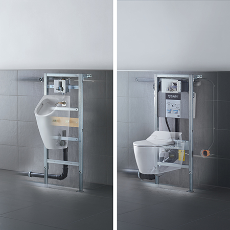Duravit fornisce soluzioni complete e tecnologicamente strutturate come unico produttore: i moduli di installazione a parete DuraSystem®, le placche di comando abbinate e un ampio assortimento di prodotti (ceramica, prodotti per il wellness mobili per il bagno, accessori, vasche, piatti doccia e rubinetteria).